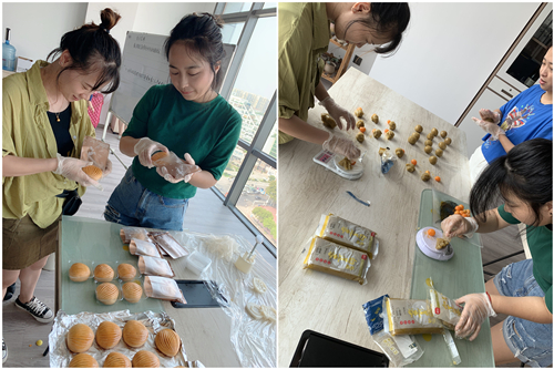 活動期間,大家都興致勃勃、躍躍欲試。有的和面皮,有的包餡,有的壓模,大家分工合作,互相配合。一邊交流方法,一邊嘮嘮家常,一副其樂融融的景象,做的月餅也一個比一個精美。等到月餅出爐,香氣四溢,大家品嘗著自己親手制作的月餅,都高興極了,現場歡聲笑語不斷。