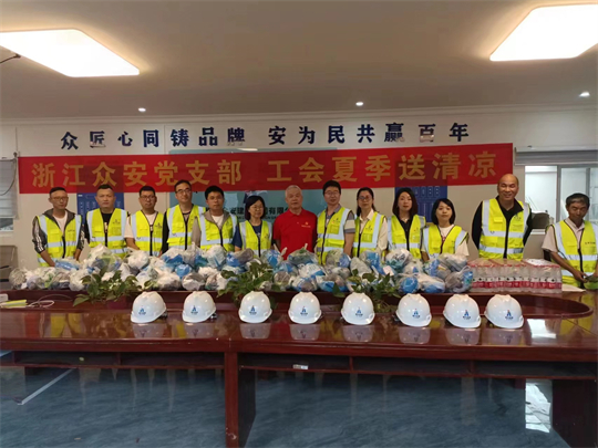 除了追尋紅色足跡,重溫黨史記憶,集團黨支部、工會還前往眾安在遵義承建的明信鳳棲臺項目,為一線工人們送去清涼慰問,向一線工人們傳遞關愛和溫暖。